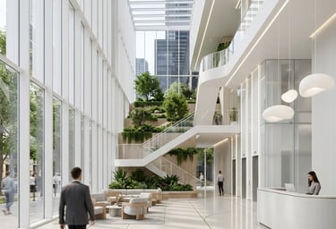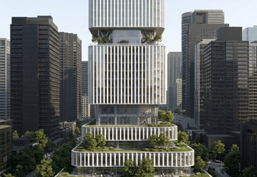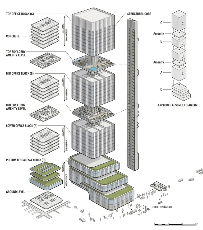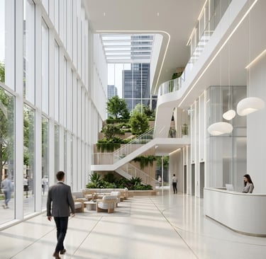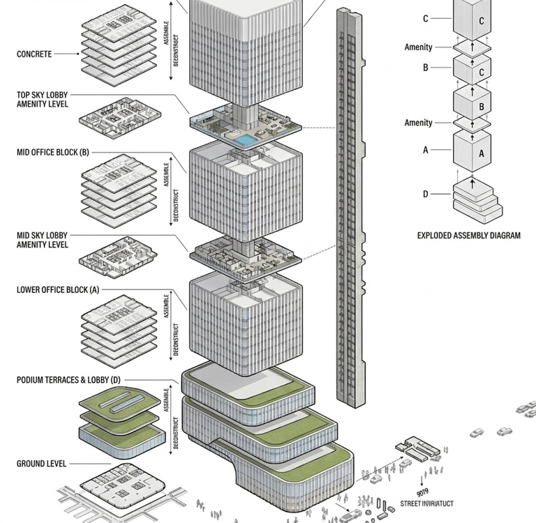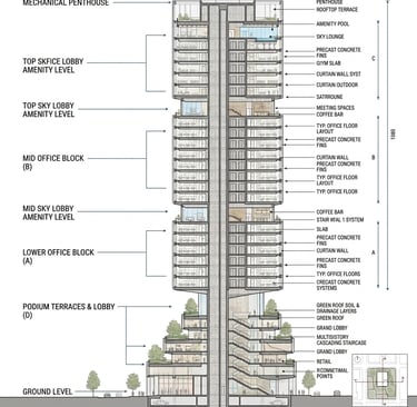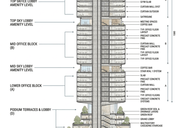 At the base, the tower engages the public realm through a landscaped podium and an active ground plane. Generous setbacks and integrated greenery create a transition between street life and workplace environments, fostering a welcoming and human-scaled experience. The lower levels accommodate flexible office lobbies, shared amenities, and informal meeting spaces that encourage interaction beyond traditional workplace boundaries.