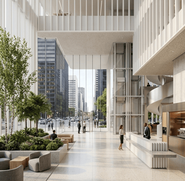 Internally, the office floors are organized for adaptability, supporting a range of contemporary work modes, from collaborative open plans to focused, enclosed environments. Clear structural spans, high ceilings, and efficient core placement allow tenants to evolve with changing organizational needs.