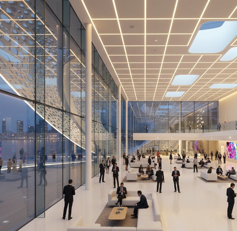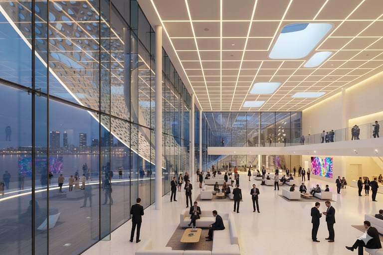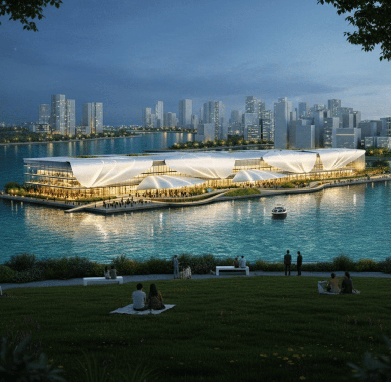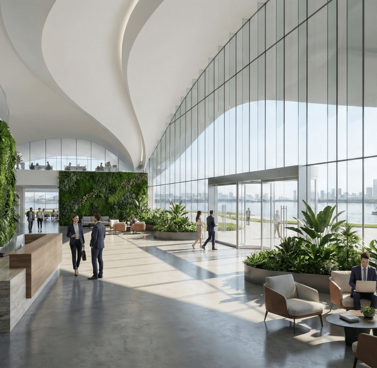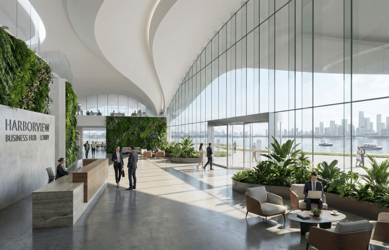 The waterfront condition plays a central role in shaping the identity of Harborview Business Hub. The building massing steps and curves along the edge of the water, allowing uninterrupted visual and physical access to the shoreline while framing a sequence of public plazas, terraces, and waterfront rooms. These spaces are designed to support informal meetings, cultural events, and moments of pause within the daily rhythm of a working district.