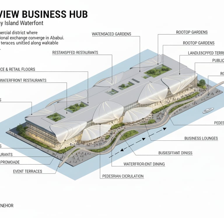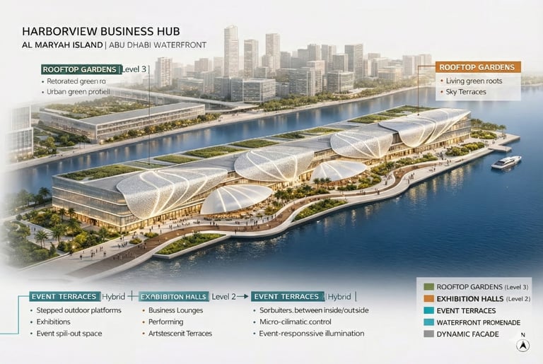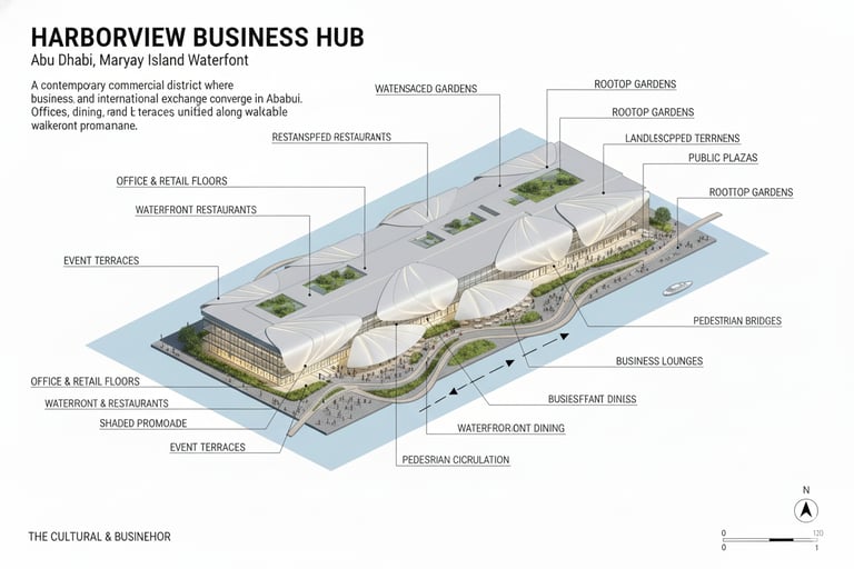 Harborview Business Hub functions as more than a commercial development. It operates as an urban connector that links finance, culture, leisure, and public life while contributing a distinct civic space to Abu Dhabi’s evolving waterfront. Through the integration of architecture, landscape, and public realm, the project supports a contemporary vision of work, community, and shared urban experience within a global business district.
