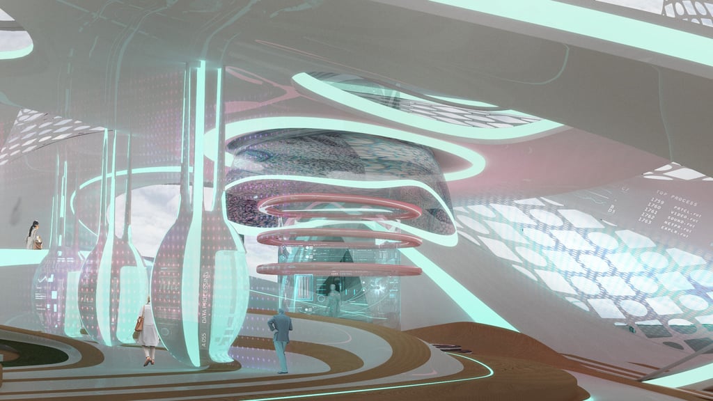 The project positions the workplace as a cyber-urban interface testing how architecture, media, and virtual platforms can be orchestrated into a single, legible system of hybrid realities.