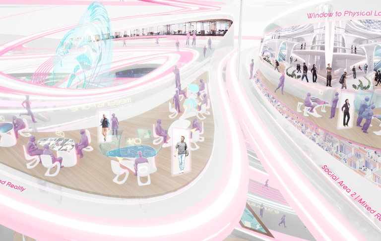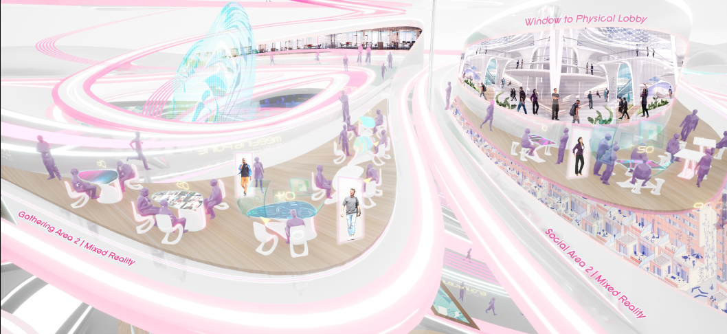 Furniture, partitions, and media surfaces participate in this language: walls inflate into VR hubs, kinetic screens open and close windows into the virtual office, and ceiling bands thicken or multiply as the social spaces become more digitally saturated. Users don’t need manuals – the space itself explains how virtual each environment is meant to be.