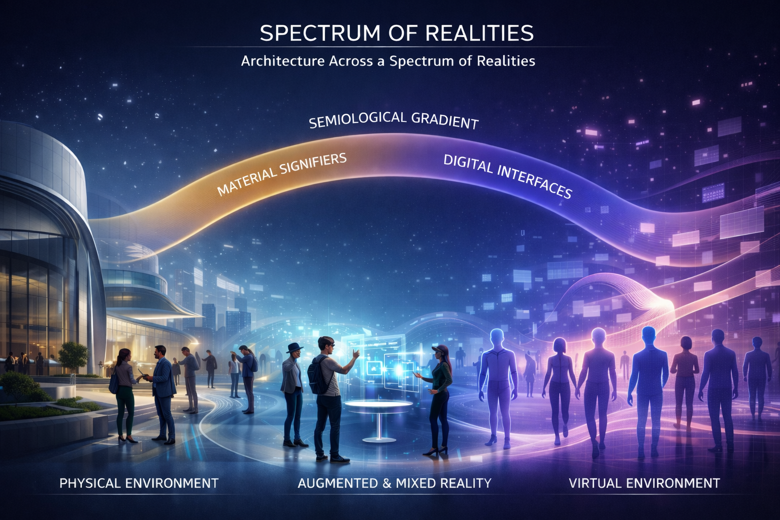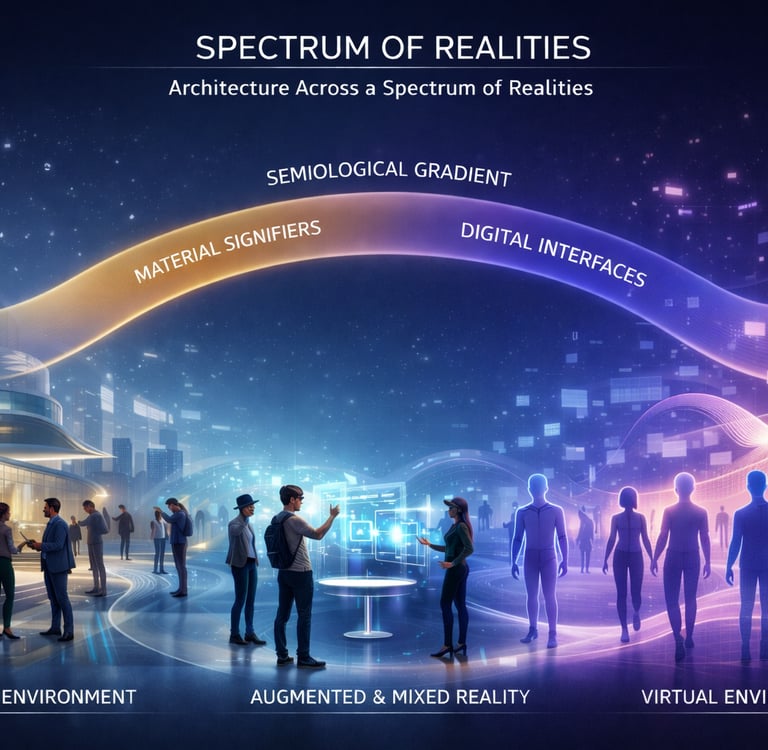 a continuous spectrum where spatial interfaces, signs, and cues shift from material architectural markers to fully digital languages. Spectra positions architecture not as a static physical artifact, but as an adaptive communication system guiding behavior across hybrid and networked realities.