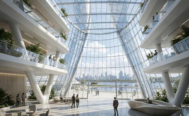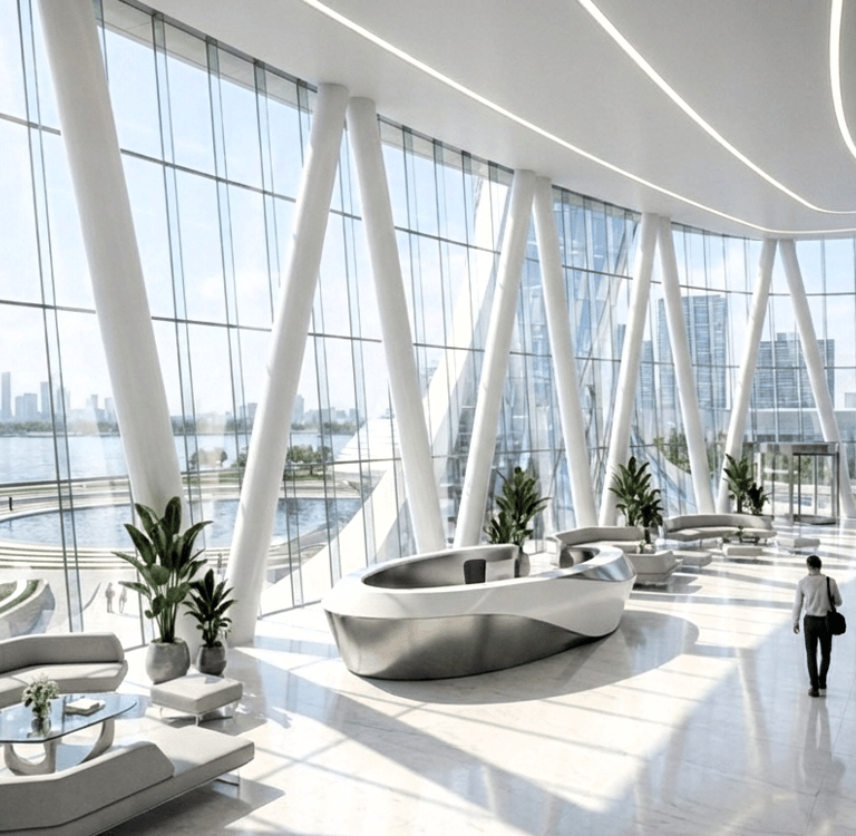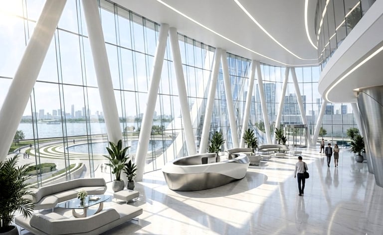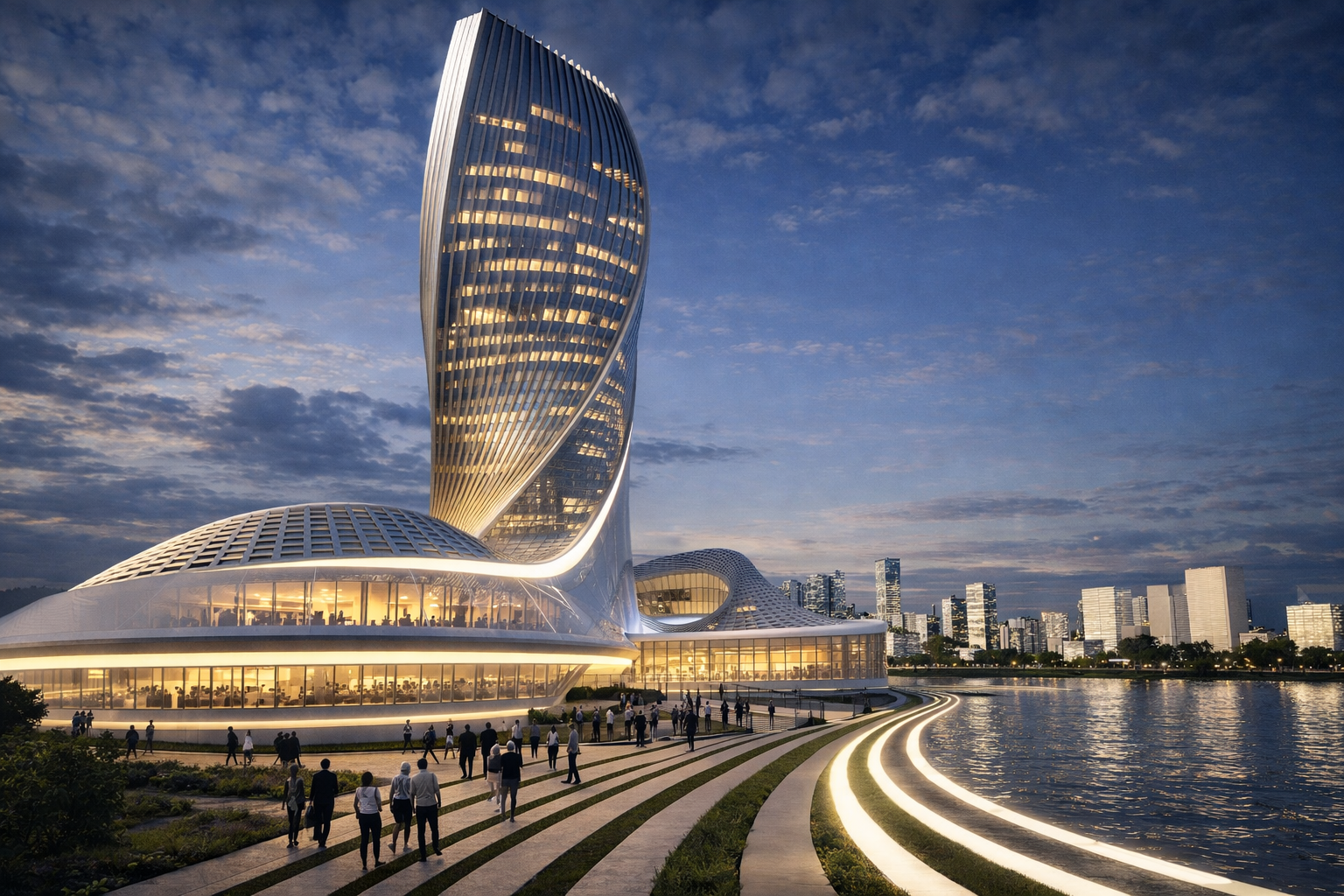 Materially, Tower 01 expresses contemporary luxury through high-performance glazing, refined metallic framing, and integrated architectural lighting that emphasizes curvature and precision at dusk. The result is a signature asset designed to elevate the perceived value of the district, strengthen leasing and sales narratives, and deliver a memorable waterfront experience aligned with global-market expectations.