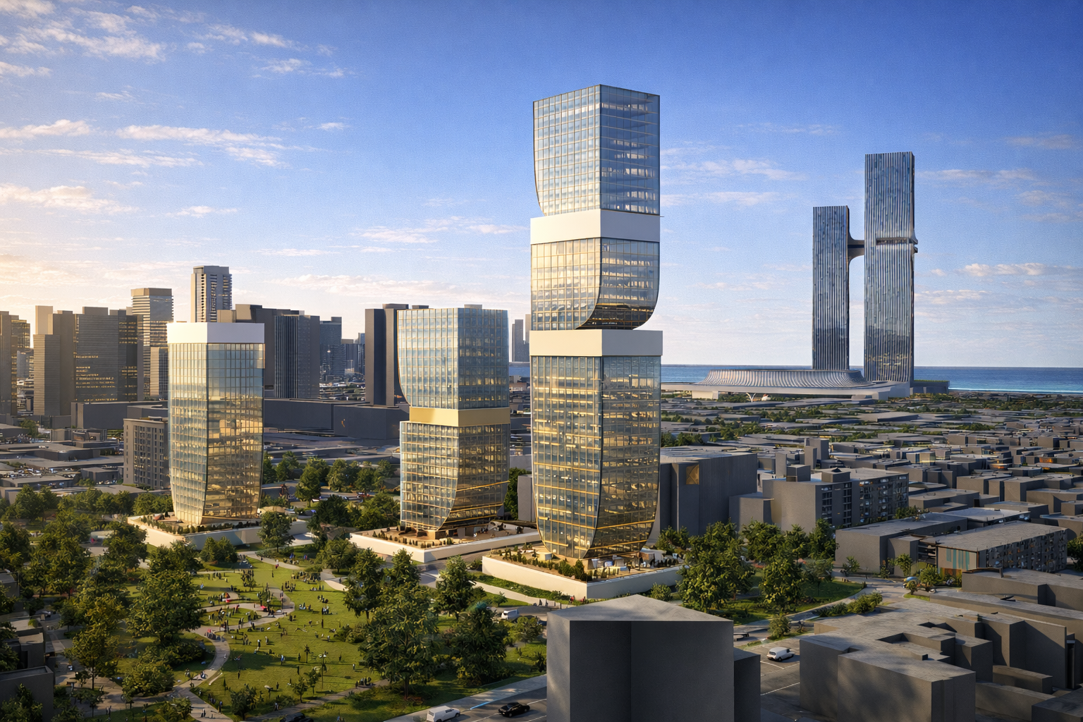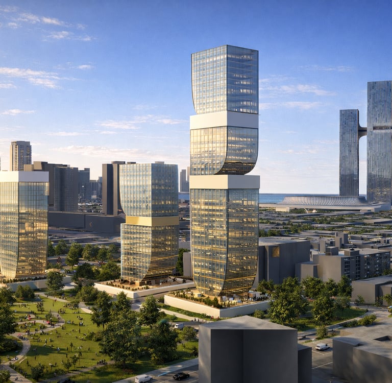 The three tower ensemble is designed to work as a cohesive system rather than isolated elements. Each tower rises from a shared podium, establishing a strong architectural relationship between residential, commercial, and public programs. The sculptural massing introduces variation in height and form, creating a dynamic skyline profile while maintaining visual continuity across the site.