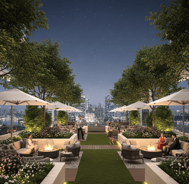 At the base, stepped podiums integrate residential, commercial, and amenity spaces while establishing a strong relationship with the public realm. Landscaped terraces, pedestrian promenades, and open gathering areas activate the waterfront edge, encouraging movement and social interaction. This ground-level strategy reinforces continuity between the built environment and the natural context.