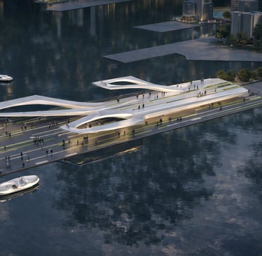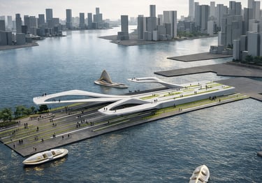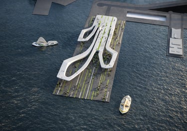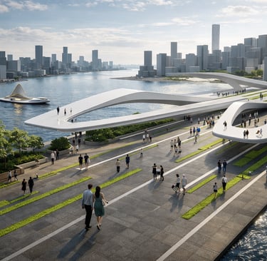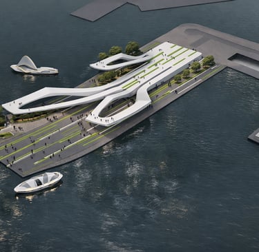 The design is organized as a large-scale pedestrian landscape that folds, rises, and opens toward the water. These subtle shifts in elevation create terraces, viewing platforms, and resting zones that allow people to engage with the waterfront at different scales. The plaza functions as both a passage and a destination, accommodating walking, gathering, and informal public activity.