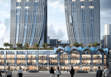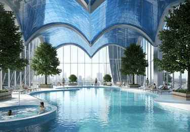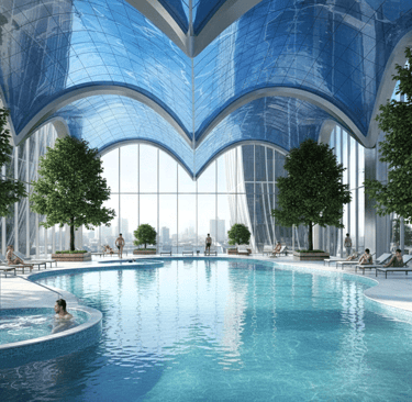 Architecturally, the promenade is shaped as a continuous sculptural walkway that links amenities, leisure spaces, and garden pockets into a unified spatial sequence. Fluid geometry and carefully modulated edges create moments of pause, gathering, and visual engagement, allowing movement to become both purposeful and experiential.