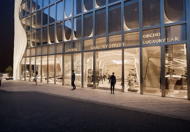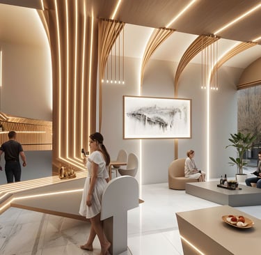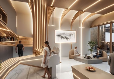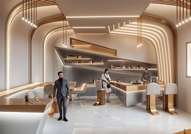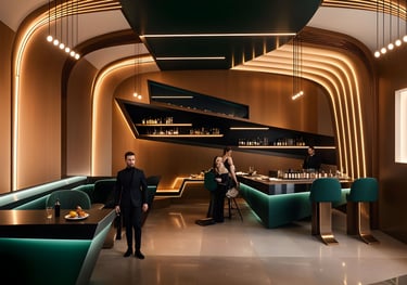 Step into a space where avant-garde design meets timeless elegance. This high-concept lounge bar features a striking interplay of flowing architectural curves and sculptural lighting elements, creating an immersive, cinematic atmosphere. Custom-contoured ceiling arcs and wall panels converge seamlessly, guiding the eye through the space with rhythm and grace.