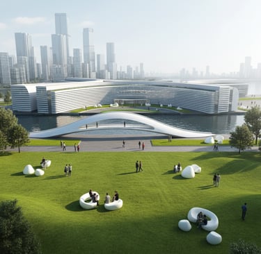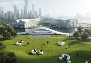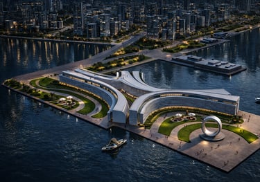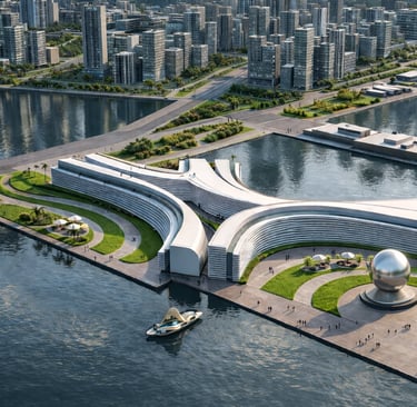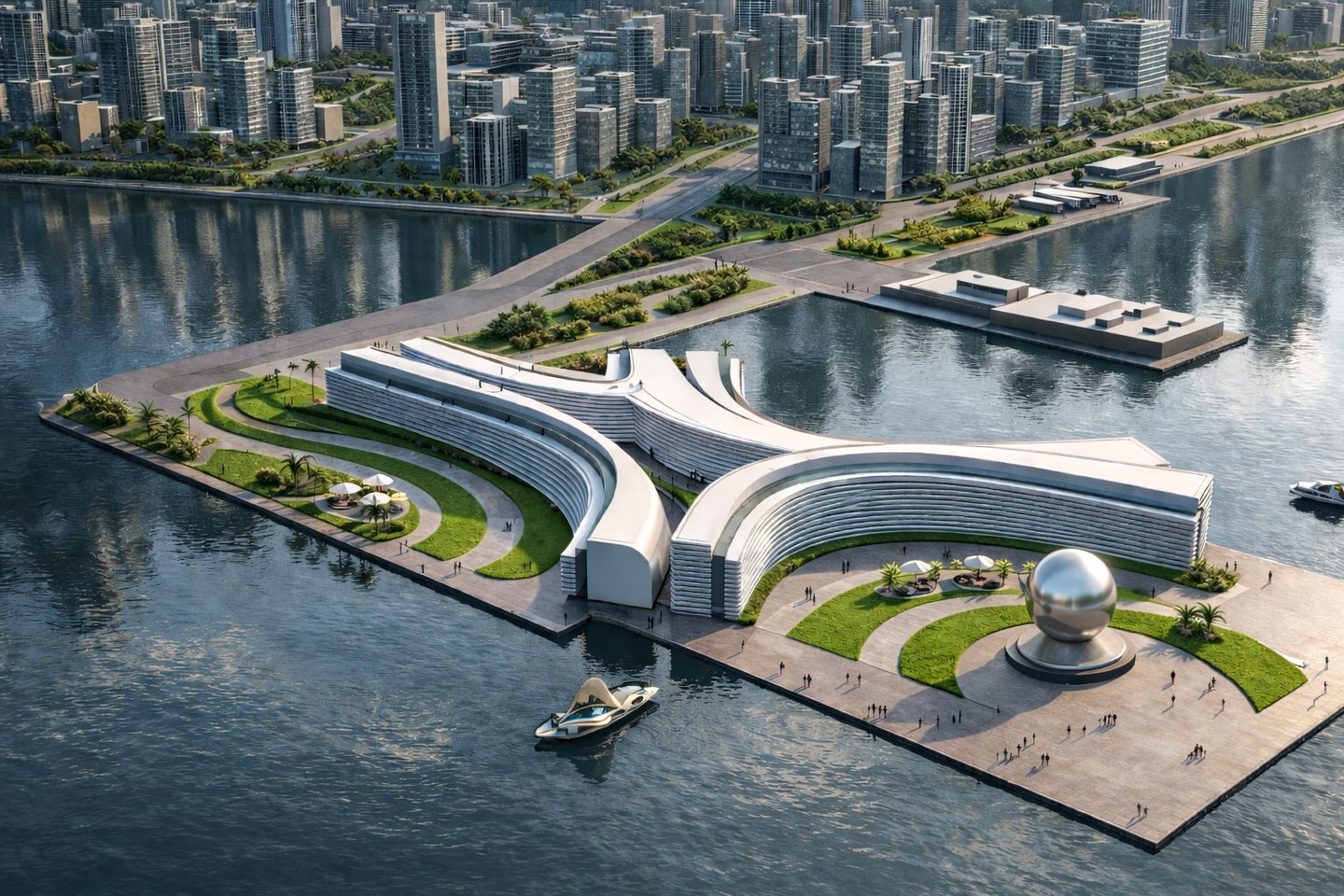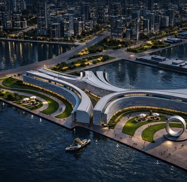 The building’s curved promenades and elevated walkways offer uninterrupted views of the marina, encouraging movement, gathering, and public engagement. Landscaped terraces cascade toward the water, creating settings for open-air events, art installations, and seasonal festivals.