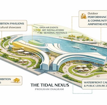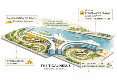 The architectural expression prioritizes accessibility, cultural visibility, and civic experience — positioning Tidal Nexus as a place where residents and visitors gather to celebrate art, community, and shared public life.