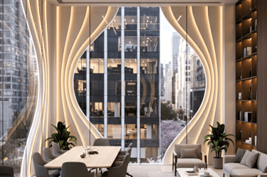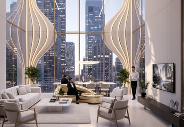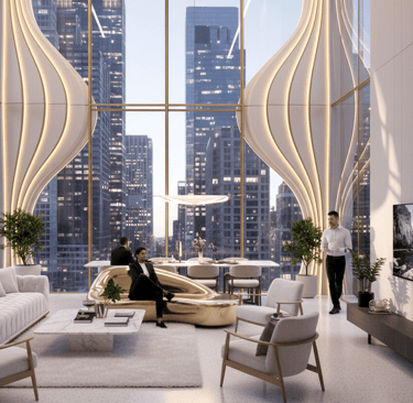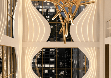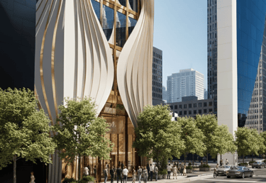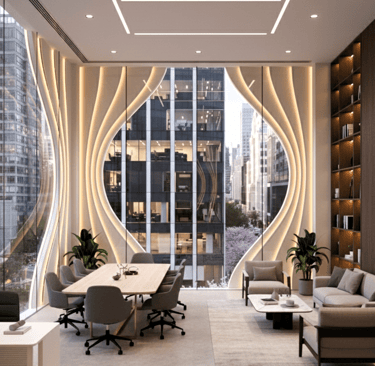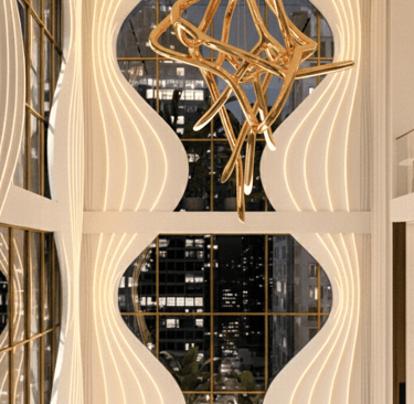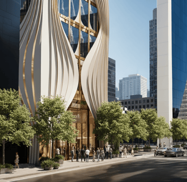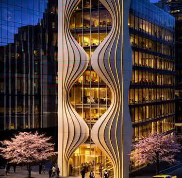 This mixed-use building is conceived as a sculptural landmark within the urban core, defined by a series of vertical, fluid fins that rise from the ground in a graceful wave-like rhythm. Made of light-toned composite materials edged in warm gold, these dynamic ribbons twist upward to form a visually striking façade that evokes movement, elegance, and craftsmanship.