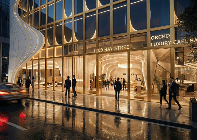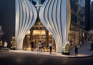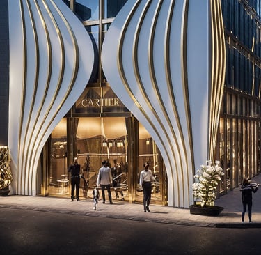 At street level, the central glass entry is framed by the curving structure, with gold signage and abstract sculptural installations lending a cultural, gallery-like presence to the retail storefront. The façade is more than aesthetic — it provides shade, reinforces brand identity, and creates a memorable urban gesture.