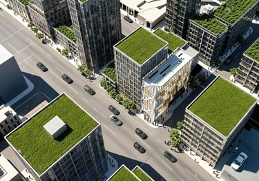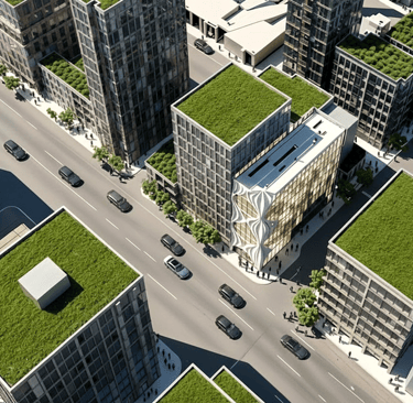 Above, the building transitions into contemporary office levels and is crowned by a lush green roof, designed to promote sustainability, manage stormwater, and reduce heat absorption. This planted roofscape not only enhances environmental performance but also contributes a soft, natural contrast to the building’s sculptural form — blending architecture, ecology, and urban design into a cohesive whole.